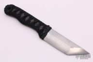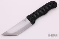 This Tanto from Steve Corkum features a satin finished chisel ground blade with a nice hamon and notched thumbrest, .190" blade stock and 1.254" blade depth, full tang hidden tang construction. The handle has black/white stingray skin under a Turk's head guard and flat black cord wrap. Has some light scratches and oxidation, otherwise good condition.