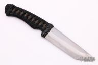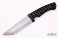 This knife from Steve Corkum features a satin finished tanto blade with a nice hamon, .221" blade stock and 1.547" blade depth, full tang hidden tang construction. The handle has brown stingray skin under a Turk's head guard and flat black cord wrap. Has some light scratches, otherwise excellent condition.