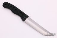 This knife from Steve Corkum features a satin finished tanto blade with a nice hamon and fileworked spine, .216" blade stock and 1.093" blade depth, full tang hidden tang construction. The handle has black stingray skin under a Turk's head guard and flat black cord wrap. Has some light scratches, otherwise excellent condition.