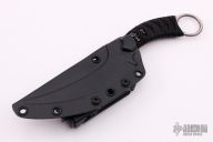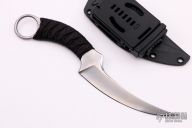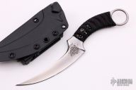 This Mako from Bastinelli Knives features a satin finished upswept blade, .158" blade stock and .910" blade depth, full tang construction. The handle has a black cord wrap over dark red cord and menuki with a one-inch finger hole on pommel. Includes kydex sheath with TekLok and a padded zippered case. New from maker.