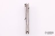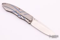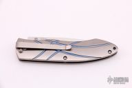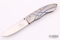 This button lock folder by Arno Bernard has a satin finished blade and a sleek brushed titanium handle with a blue anodized milled pattern. Both the thumbstud and the release button have a blue gemstone inset. Tip down carry clip. Very smooth action with nice lockup and blade seating. Excellent condition.