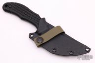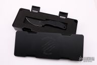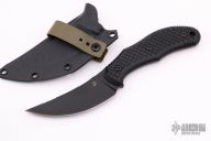 This Chopper by Bastinelli Knives features a black upswept blade with notched thumbrest and mortis tang construction.  .125" Blade Stock.  1.116" Blade Depth. The handle has black textured G10. Comes with kydex sheath with loop and a large hard case. New from maker.