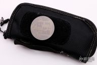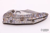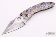 This Stitch by Borka Blades features a clip point M390 Nichols Damascus San Mai blade with swedge, thumb hole and dual thumb studs/blade stops. The handle is comprised of a flamed titanium frame with matching tip up clip over titanium barrel spacers. Includes zippered case and titanium patch with laser engraving. Has a few light scratches, otherwise excellent condition.