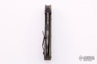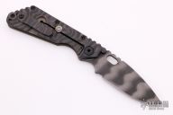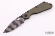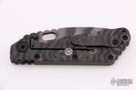 This SMF by Strider Knives, features a tiger striped blade and textured green G-10 with a flame finished titanium handle. Notches on thumbrest, rear of handle, and lockup. Blade is centered when closed and locks up with no play. Has a few light scuffs, otherwise excellent condition. Vintage old school flamed handle.