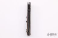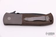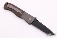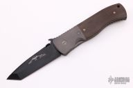 This PoBoy Super CQC-7 Folder from Emerson features a black chisel ground tanto blade with bead blast dove tailed titanium bolsters, green canvas micarta scales, bead blast titanium liners, tip up stainless steel clip, checkered titanium backspacer. Thumb Disc, wave feature, notched thumbrest. Nice detent, lockup and blade seating. Excellent condition.