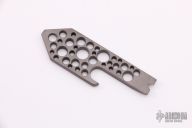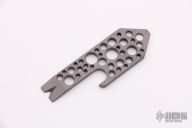 "Standard features include pry tip with wire stripper notch, bottle opener, and screwdriver tip. Special features on this version include extra thick titanium and a series of decorative holes which further reduce weight and add extra grip." Excellent condition. Includes card and bag.