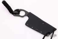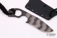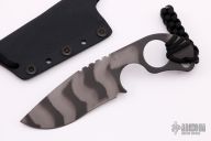This SLCC by Mick Strider features a tiger striped recurve blade with a notched thumbrest, .126" blade stock and 1.480" blade depth. The handle has a finger groove and ring. Comes with a kydex sheath. Has some light scratches, otherwise excellent condition.