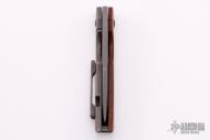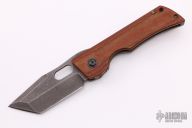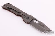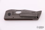 This Mini 56 by Billy Cho Knives features an acid tumbled tanto blade with thumbhole. The handle has a natural canvas micarta and a tumbled titanium frame, zirconium pivot collars and floating backspacer with a tumbled titanium tip up clip with hidden screws. Comes with a zippered case. Nice detent, lockup and blade seating, rides on bearings. Has a few scuffs, otherwise excellent condition.