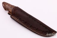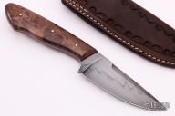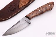 This knife by Kyle Hanson features a drop point blade with false top edge and nice hamon, .181" blade depth, full tapered tang construction. The handle has nice redwood burl scales with red liners. Comes with a hand tooled brown leather sheath. Excellent condition.