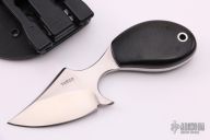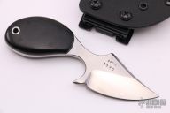 This knife by Mickey Yurco features a clip point satin finished blade with .159" blade stock and 1.380" blade depth, full tang construction. The handle has black canvas micarta scales with black pins and a lanyard hole. Comes with a kydex sheath with small TekLok. Excellent condition.