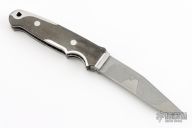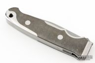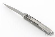 This Linerlock by Leonardo Frizzi features a Chad Nichols XHP Core "Boomerang" San Mai Stainless Damascus blade with notched thumbrest. The handle has mirror 416 polished stainless steel scales with fat carbon inlays
