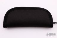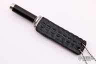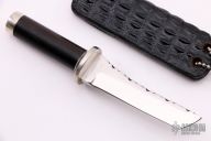 This knife by Larry Mensch features a satin finished tanto blade with fileworked spine, .136" blade stock and .766" blade depth, hidden tang construction. The handle has a nickel silver guard and butt with ebony wood grip. Comes with a black leather neck sheath and zippered case. Excellent condition.