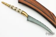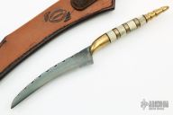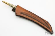 This knife by Bob Crotsley features a black hawkbill blade with fileworked spine, .163" blade stock and 1.032" blade depth, hidden tang construction. The handle is stacked with brass and bone with black spacers. Comes with a hand tooled brown leather sheath. Excellent condition. Comes with a zippered case.