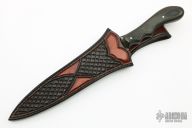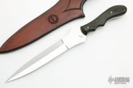 This Dagger by Larry C. Mensch features a mirror finished double-edged blade with .183" blade stock and 1.227" blade depth, full tang construction with black linen micarta scales. Comes with a hand tooled brown leather sheath made by TreeStump Leather, and a zippered case. Excellent condition.