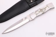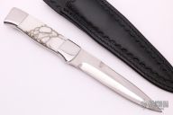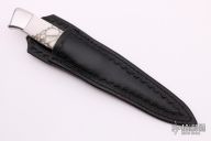This Fighter by Don Lozier features a mirror polished double hollow ground blade with satin flats, mirror polished stainless steel dovetailed bolsters and white turquoise scales with pyrite matrix black liners, .188" blade stock and 1.121" blade depth, full tang construction. Very nice work. Comes with a hand tooled black leather sheath and a zippered case. Excellent condition.