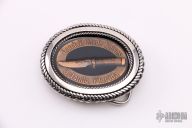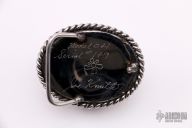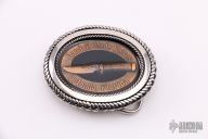 This belt buckle features a resin encased "Randall Made Knives Orlando, Florida" emblem with what looks like a model 3 blade that is also marked "Randall Made knives Orlando, FL" The back of the buckle is marked "Model 041, Serial #149, Joe Knuth". Excellent condition. 3" wide.