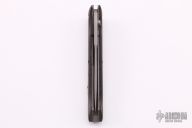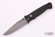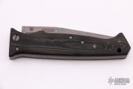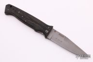 This 1993 Soldier of Fortune Knife by Butch, Rainy and Shawn Vallotton features a bead blasted clip point blade with a checkered thumbstud and false top edge. The handle has black linen micarta scales, bead blasted stainless steel liners and backspacer. Nice detent, lockup and blade seating. SOF-93 #30 on blade. Has some light scuffs on the bead blast finishes, the spring has been removed so it is no longer a D/A auto, otherwise good condition. Comes with a velcro belt sheath.