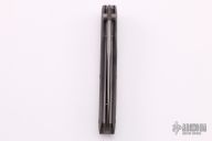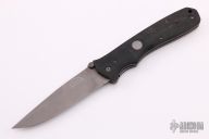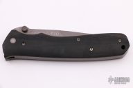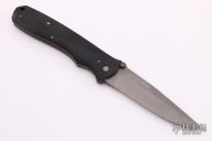 This knife by Butch Vallotton features a bead blasted clip point blade with notched thumbrest and dual thumbstuds. The handle has black micarta scales, bead blasted stainless liners and backspacer. Nice detent, lockup and blade seating. SOF-96 #30on blade. Has some light scuffs, otherwise excellent condition. Comes with black nylon belt sheath.