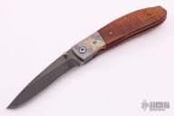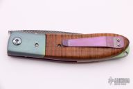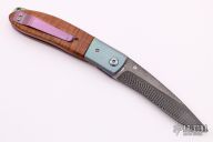 This Linerlock Folder by Ross K Mitsuyuki features a Devin Thomas Herring Bone Pattern Stainless Damascus blade with a single thumbstud with opal inlay. The handle has anodized titanium dovetailed bolsters with a koi fish engraved on the front bolster, stabilized Hawaiian Curly Koa scales, anodized titanium liners and backspacer, and a tip up anodized titanium clip. Nice lockup and lockup. New from maker. Comes with zippered case and handwritten COA.