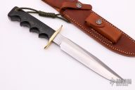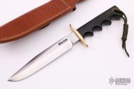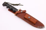 This Model 16 from Randall Made Knives features a satin finish clip point blade with sharpened top edge, 0.218" blade stock and 1.216" blade depth, full tang construction. The handle is comprised of a brass double guard and black linen micarta finger grip handle. Brass lanyard tube with lanyard in pommel. Includes brown leather sheath with belt loop. Excellent condition.