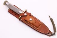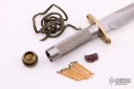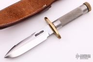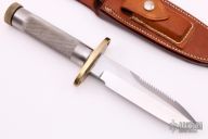 This Randall Model 18-5.5 has a stainless steel blade with sawteeth on spine and sharpened top edge, .237" blade stock and 1.254" blade depth, hidden tang construction. The handle has a brass double guard and threaded butt cap, and a knurled stainless steel handle, has some survival items in the handle. Comes with roughback brown leather sheath and stone. Has a couple light scratches, otherwise excellent condition.