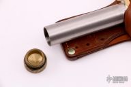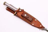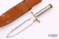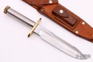 This Model 18-7.5 Attack Survival from Randall Made Knives has a spear point blade with sharpened top edge and sawteeth, .222" blade stock and 1.361" blade depth, hidden tang construction. The handle has a brass guard and butt cap, stainless steel handle. Comes with a roughback brown leather sheath made by Byrd's Leather.  Excellent Condition.