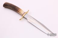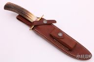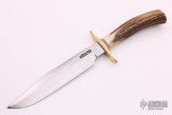 "This Randall Knives Model 1 was made famous by Allied combat troops in World War II and has since been widely used in all theaters of war." .200" blade stock. 1.236" blade depth, satin finish blade with sharpened top edge. The handle has a brass guard and  stag grip with red/white/blue spacers. Includes a brown leather sheath. Knife is in excellent condition and shows no signs of use/carry.