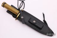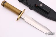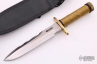 This Model 18-7.5 Attack Survival from Randall Made Knives has a spear point blade with sharpened top edge and sawteeth, .216" blade stock and 1.364" blade depth, hidden tang construction. The handle has a brass guard and butt cap, stainless steel handle with cord wrap. Comes with a black leather sheath.  Excellent Condition.