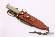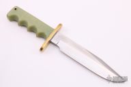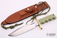 This model 14 by Randall Made Knives features a satin finished blade, .210" blade stock. 1.317" blade depth, stainless steel blade. Sharpened top edge. Brass guard, jade G-10 ("circuit board") handle, full tang construction. Lanyard hole at the butt. This knife was designed to meet the demand for an almost indestructible all-purpose knife, though it is especially suited for combat and survival purposes. Comes with brown leather sheath. Excellent condition. Very rare handle material from Randall.