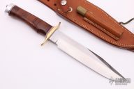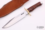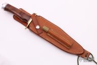 This Model 14 CDT by Randall Made Knives features a clip point satin finished stainless steel blade, .219" blade stock. 1.386" blade depth. Sharpened top edge. Brass double guard and duralumin butt, stacked leather grip with red/white/blue spacers. Cut Down hidden tang. This knife was designed to meet the demand for an almost indestructible all-purpose knife, though it is especially suited for combat and survival purposes. Comes with a brown leather sheath and a zippered case. Excellent condition.
