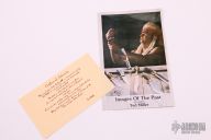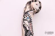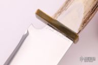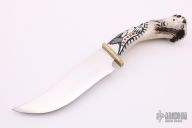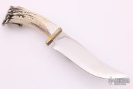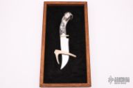 This knife by Ted Miller features a clip point mirror polished blade with .134" blade stock and 2.23" blade depth, hidden tang construction. The handle has a brass guard and a carved crown stag grip with 14 turquoise stones, 2 rubies and 7 red stones inlaid into the handle. The blade has been engraved with a Indian chief wearing a head dress. The top of the knife has a bear face looking to the left. "Collectors #25" is etched onto the ricasso. Comes with a 20" X 10.5" Shadow Box, COA and Miller Brochure. Excellent Condition.