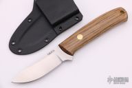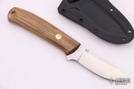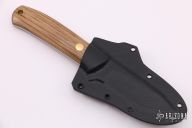 This Model 30 from Dan Crotts features a satin finish drop point blade. .123" blade stock and .948" blade depth. The handle is comprised of Tiger Myrtle wood scales with black liners and brass pin and lanyard tube over full tang construction. Includes kydex sheath with belt loop set up for horizontal carry. New from maker.