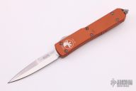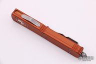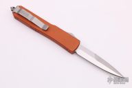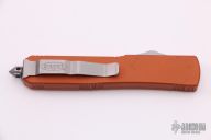 This Ultratech OTF automatic by Microtech Knives features a D/E satin finished bayonet grind blade with a sharpened top edge. Stainless steel clip, tip down. Glass breaker. Orange aluminum frame. Dated 08/2014 and serial number 45225. Comes with Microtech box and papers. Has some scuffs/scratches, otherwise good condition.