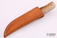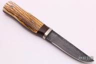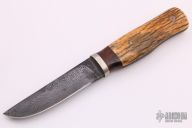 This fixed blade by Lowell Bray features a Damascus drop point blade with a hidden tang construction.  .223" Blade Stock.  1.036" Blade Depth. The handle features a steel guard, a wood spacer and mammoth scales.  Includes a brown leather sheath.  Light scuffs are visible on the handle otherwise the knife is in good condition.
