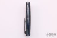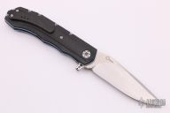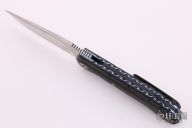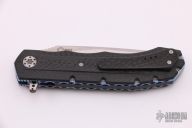 This L51 by Andre Thorburn features a hand rub satin finished blade with mirror polished flats, notched thumbrest and flipper, false top edge. The handle has carbon fiber scales, anodized titanium liners, black G-10 backspacer, tip up carbon fiber clip. Rides on IKBS. Excellent condition.