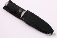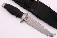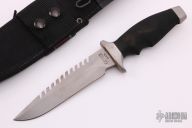 This LMF Tactical by Gerber features a bead blasted clip point blade with sawteeth on the spine, .241" blade stock and 1.241" blade depth, hidden tang construction. The handle has bead blasted stainless steel guard and butt and a foam handle. Comes with black nylon sheath. S/N 026625. Has some oxidation on blade and guard, otherwise good condition.