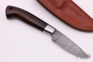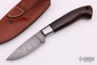 This Hunter by Steve Mullin features a Damascus blade with .124" blade stock and 1.019" blade depth, hidden tang construction. The handle has stainless steel bolsters and a cocobolo grip. Comes with a brown leather sheath. Excellent condition.