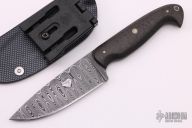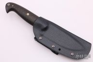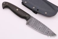 The TTKK was designed in collaboration with Joe Talmadge and is a utility knife with lots of uses in the kitchen. Damascus blade, .121" blade thickness and 1.493" blade depth. Notched thumbrest. Full tang construction. Comes with a kydex sheath. The handle has carbon fiber scales with mosaic pins, the contours give the knife a great feel in the hand. Excellent condition.