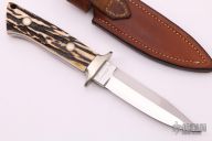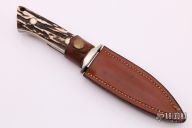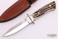 This knife by Dan Stranahan features a mirror finished blade with a false top edge, .191" blade stock and 1.947" blade depth, full tapered tang construction. The handle has a nickel silver guard, stag scales with red liners. Comes with a brown leather sheath. Has a few light scratches, otherwise excellent condition.