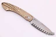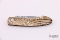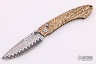 This T12 button lock from William Henry features a San Mai Damascus blade with single thumbstud. The handle has a mokume frame. Comes with brown leather sheath. Has a few light scratches, otherwise excellent condition. Comes with brown leather pocket sheath.