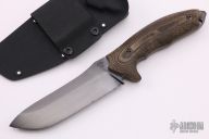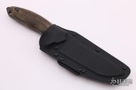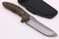This knife by Messerkonig features a black partially serrated blade with notched thumbrest, .215" blade stock and 1.543" blade depth, full tang construction with black canvas micarta scales. Comes with a kydex sheath. Excellent condition.