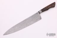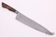 This outstanding kitchen knife by Master Smith Haley DesRosiers features a multi-bar Damascus blade with integral bolster, .103" blade stock and 2.035" blade depth, hidden tang construction with curly wood (walnut?) handle. Comes with a zippered case. Excellent+ condition.