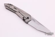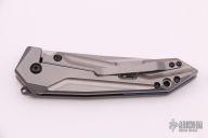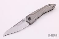 This knife by Zero Tolerance is a GTC Knives design, it features a stonewashed tanto blade with flipper. The handle has a milled and bead blasted titanium frame with tip up reversible titanium clip, lanyard hole at the butt, blue backspacer. Nice detent, lockup and blade seating. Excellent condition. #5596