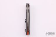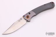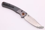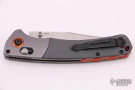 This 15080-1 Crooked River is part of the Benchmade Hunt series. It features a satin finished bowie style blade with swedge and dual thumb studs. The handle is comprised of titanium bolsters and gray G10 scales over steel liners and orange G10 backspacer. Orange anodized aluminum pivot collar and AXIS lock. The black coated stainless steel pocket clip is reversible for left or right hand tip up carry. Excellent condition.
