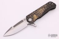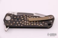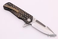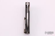 The Proxima started life as the Gigantes. For folks that wanted a larger than life knife it was awesome, but for the rest of planet Earth an adjustment in attitude was required. We drew-down the overall length to 8.8″ with a 4.9″ closed length for the pocket and 3.9″ blade length. All materials are of 3/16″ nominal stock, making for a very EDC friendly thickness. We played with several twists on the original name but as the prototype was carried by Greg, he kept saying, This knife is too awesome to get a spin-off name. Since every time anyone needed to look at the prototype it was in Greg’s pocket… always near, thus: Proxima. This is THE knife carried by Greg these days. As he says: I love the flipper/hilt and the basic meanness of this thing! It just looks bad ass and I look for reasons to snap it out all day What else can we say? This one has a tumbled S35VN blade with fullers, notched thumbrest and flipper. The handle has a black coated and texture anodized titanium frame with an anodized and tumbled tip up titanium clip. Has some light stains in the fuller of the blade, otherwise excellent condition.