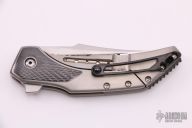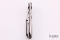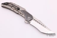 This Astio by Todd Begg features a mirror finished tanto recurve blade with satin flats and mirror polished fullers, RWL-34 blade steel. The handle has a satin finished titanium frame with zirconium and silver star strike carbon fiber inlays, black DLC coated and jewel iced titanium backspacer and tip up clip with ceramic ball, jewel iced titanium pivot collars. Rides on ceramic IKBS, nice detent, lockup and blade seating. Has a ceramic detent ball. Excellent condition.
