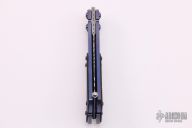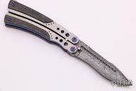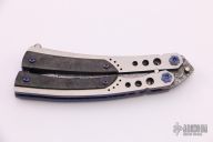 This Lepid Balisong by Patrick Famin features a harpoon style recurved Damasteel blade with swedge. The handle is comprised of a two-tone anodized titanium frame with jeweled interior and marble carbon fiber overlays, anodized titanium barrel spacers. Ball latch on pommel. Excellent condition.