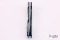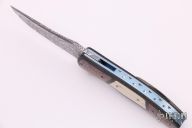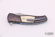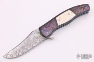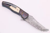 This LL-DD Flipper by George Muller features a Damasteel blade with a false top edge and flipper. The handle has lightning strike carbon fiber scales with mokuti and mammoth ivory inlays, anodized titanium liners and fileworked backspacer, and a black timascus tip up clip. Features IKBS. Nice detent, blade seating and lockup. Excellent condition.