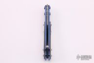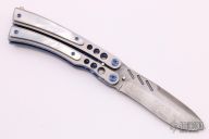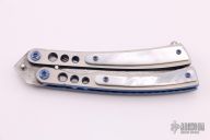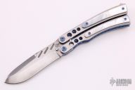 This Lepid Balisong by Patrick Famin features a recurve Damasteel blade with swedge. The handle is comprised of a two-tone anodized titanium frame with jeweled interior and mother-of-pearl overlays with black liners, anodized titanium barrel spacers and screws, ball latch on pommel. Excellent condition.