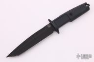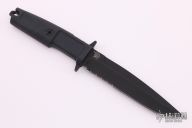 This Col Moschin Fighter has a matte black N690 Cobalt stainless steel partially serrated drop point double-edged blade with hidden tang and notched thumb rest. Blade width is 1/8", depth 1-1/4". Handle is black non-slip Forprene with lanyard hole. Excellent condition.